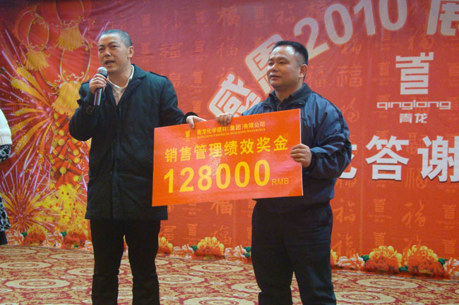 會上,青龍公司重點表彰了優(yōu)秀代理商代表和企業(yè)優(yōu)秀員工,其中對廣西青龍公司曾知博經(jīng)理個人銷售管理績效獎金高達12.8萬元,曾總發(fā)表感言說,青龍公司是個一個重信譽,講誠信,有實力的企業(yè),非常感謝青龍能給自己這樣一個實現(xiàn)自我價值的平臺,并表示愿意和廣西青龍廣大同仁一起努力拼搏,2011年再創(chuàng)輝煌。