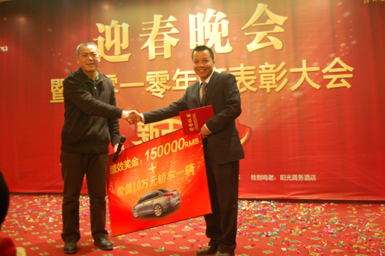 練祖耀(圖右),男,27歲,2009年9月加入青龍營銷團隊,經過自己勤奮學習,積極進取,2010年個人業(yè)績榮膺榜首,獲青龍"優(yōu)秀業(yè)務員"稱號,年終青龍董事長宋敦清先生(圖左)獎其現(xiàn)金15萬和價值10萬元小車一輛。