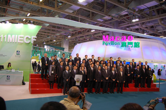 圖為:本屆展會出席政商代表(前排右三為澳門特首崔世安)在澳門展館前留影