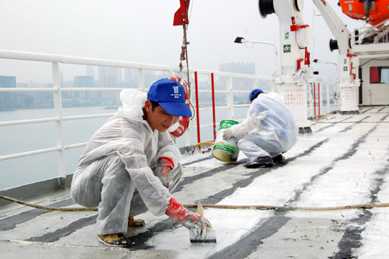接到該訂單后,3月21日,公司派一支素質(zhì)過硬的施工隊伍奔赴香港開始作業(yè),由于期間香港天氣變化反復(fù),時常下雨;待基面底漆頑固,銹跡斑斑難以清理,均為凹凸不平的麻面;再加上該郵輪白天需正常營業(yè),施工多只能在晚上進行,等等一系列因素都給施工帶來了嚴峻考驗。青龍公司歷來重視每一筆訂,注重每一個細節(jié),董事長宋敦清先生得知后,親自前往,與公司總工徐新生論證了一個較好方案后開始指導(dǎo)施工,考慮到施工部位特殊,長期在海面上風(fēng)吹日曬,之后選用了其耐候、耐酸堿、耐紫外線、耐老化、耐霉菌、耐鹽霧、耐臭氧、耐溶劑、耐磨、耐沖擊和耐油性等綜合性能優(yōu)異的