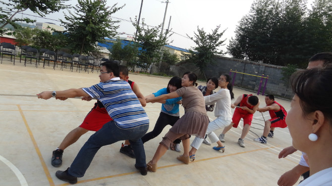 籃球賽后,雙方還進(jìn)行了激烈刺激的拔河比賽,雙方成員派出4男4女進(jìn)行拔河比賽,參賽隊(duì)員,啦啦隊(duì)、圍觀者人頭攢動(dòng),一派熱鬧的景象。隨著一聲哨響,兩邊隊(duì)員開始奮力向各自的方向拉,場(chǎng)外的啦啦隊(duì)們扯著嗓子吶喊助威,中間的紅色繩子開始搖擺,忽左忽右,僵持中,隊(duì)員臉上個(gè)個(gè)漲得通紅,經(jīng)過一番激烈的拉扯,紅繩之后到了金鷹隊(duì)這邊,勝利的喜悅彌漫了整個(gè)工廠的上空,不管是輸家還是贏家,大伙都玩得不亦樂乎。