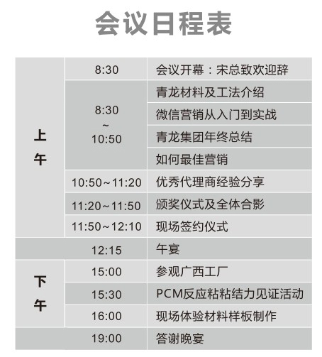 為了提高代理商的銷售積極性,促進(jìn)代理商之間的溝通和交流,增進(jìn)公司與代理商之間的感情,從而增強(qiáng)團(tuán)隊(duì)的凝聚力,提升渠道隊(duì)伍的戰(zhàn)斗力,青龍集團(tuán)將在2014年1月7日在廣西南寧(廣西分公司)舉辦2013年度會(huì)議。年會(huì)將圍繞防水行業(yè)“整合、分享、共贏”等方面展開,熱忱歡迎青龍集團(tuán)全國代理商及有志于在防水行業(yè)掘金致富的求富人士參加。
