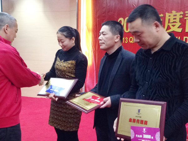 年會還對2013年度青龍集團優(yōu)秀代理商進行了表彰獎勵,并頌發(fā)“金牌代理”匾,獲得表彰的代理商也就自己市場開拓經驗與參加年會的代理朋友進行了分享。