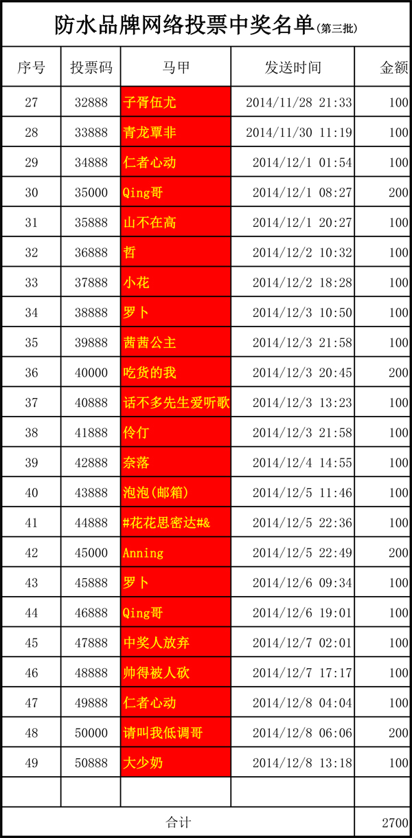 第三批中獎(jiǎng)名單公布如下:子胥伍尤、青龍覃非、仁者心動(dòng)、Qing哥、山不在高、哲、小花、羅卜、茜茜公主、吃貨的我、話不多先生愛聽歌、伶仃、奈落、泡泡(郵箱)、#花花思密達(dá)#&、Anning、羅卜、Qing哥、帥得被人砍、仁者心動(dòng)、請叫我低調(diào)哥、大少奶。恭喜他們,也請大家繼續(xù)支持青龍,為青龍投票!