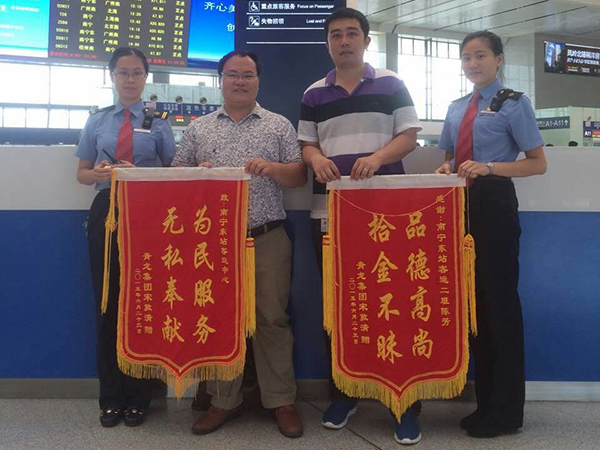 近日,青龍集團(tuán)廣西公司行政部經(jīng)理韋流武先生、設(shè)計(jì)院推廣經(jīng)理周明先生受青龍集團(tuán)宋先生之托,一行二人專程來(lái)到南寧東站客運(yùn)中心,將繡有“為民服務(wù),無(wú)私奉獻(xiàn)”和“品德高尚,拾金不昧”的大紅錦旗送到南寧東站領(lǐng)導(dǎo)和二班陳芳女士手中,衷心感謝動(dòng)車(chē)南寧東站全體工作人員的真誠(chéng)幫助和優(yōu)質(zhì)服務(wù),感謝陳芳女士品德高尚,拾金不昧的精神,并為她們的正能量點(diǎn)贊!