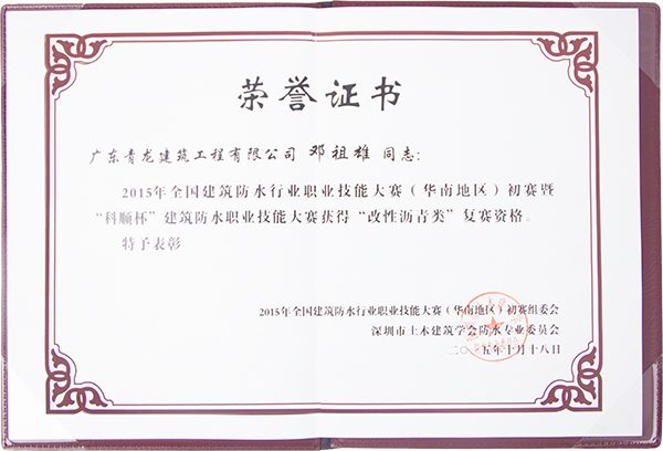10月17日至18日,由中國(guó)建筑防水協(xié)會(huì)主辦、深圳市土木建筑學(xué)會(huì)防水專業(yè)委員會(huì)承辦的建筑防水職業(yè)技能大賽暨2015全國(guó)建筑防水行業(yè)職業(yè)技能大賽(華南地區(qū))在廣東高明舉行。來(lái)自全國(guó)的12家防水企業(yè)32位選手參加了比賽,青龍公司員工鄧祖雄先生憑借在改性瀝青和高分子防水卷材上的過(guò)硬表現(xiàn),順利晉級(jí)。