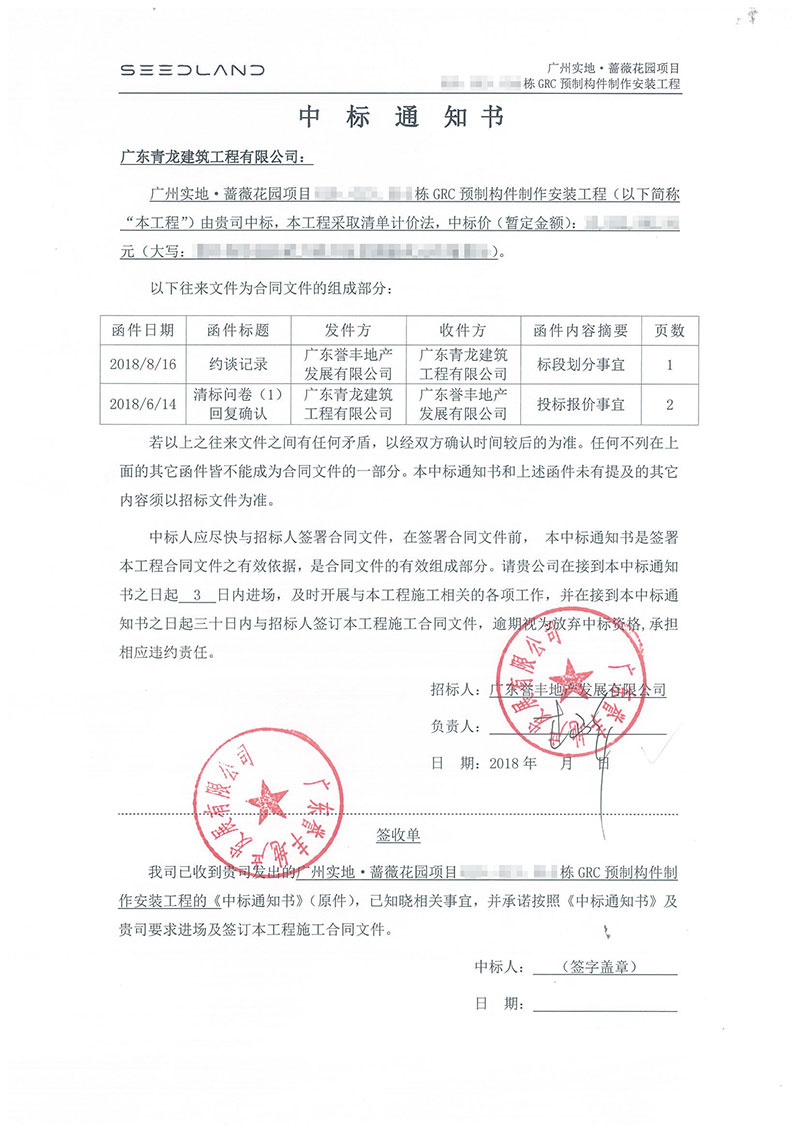 近日,廣東的青龍公司憑借強(qiáng)大的實(shí)力,成功中標(biāo)了廣州實(shí)地薔薇花園項(xiàng)目GRC預(yù)制構(gòu)件制作安裝工程,這是繼深圳坪山會(huì)展中心之后,青龍公司近期又承接的又一個(gè)千萬級(jí)GRC大單,彰顯了青龍雄厚的GRC技術(shù)實(shí)力。