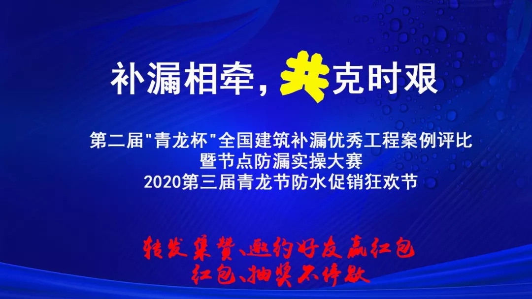 2月24日,第二屆"青龍杯"全國建筑補漏優(yōu)秀工程案例評比暨節(jié)點防漏實操大賽、2020第三屆青龍節(jié)防水促銷狂歡節(jié)將正式網上直播。