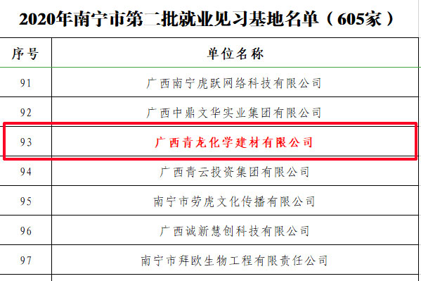 近日,從南寧市人力資源和社會(huì)保障局獲悉,為扎實(shí)推進(jìn)高校畢業(yè)生就業(yè)見(jiàn)習(xí)工作,經(jīng)南寧市人力資源和社會(huì)保障局審核通過(guò),我司廣西青龍化學(xué)建材有限公司被認(rèn)為2020年~2022年南寧市就業(yè)見(jiàn)習(xí)基地。