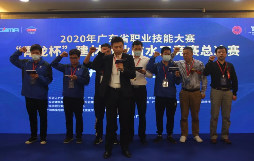 開幕式上,多次參加青龍杯防水補(bǔ)漏實(shí)操大賽,并取得非常優(yōu)異成績的參賽選手代表賴杭輝以及所有裁判員進(jìn)行了賽前宣誓。
