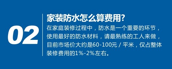 在家庭裝修過(guò)程中,防水是一個(gè)重要的環(huán)節(jié),使用最適合的防水材料,并請(qǐng)熟練的工人來(lái)做是非常重要的。目前市場(chǎng)價(jià)大約是60~100元/平米僅占整體裝修費(fèi)用的1%左右。