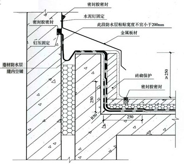1.對變形縫的防水處理必須選用變形能力強及耐老化性能的合成高分子防水卷材,并應(yīng)具備有效的密封構(gòu)造措施。 2.屋面變形縫應(yīng)避免設(shè)計成平縫,變形縫墻應(yīng)采用≥C20混凝土澆筑,不得采用磚砌。變形縫墻體宜與屋面結(jié)構(gòu)板一起澆搗,不留施工縫。如不能一次澆搗,應(yīng)在墻體澆搗前施工縫位置嵌填5x8mm遇水膨脹密封膠。 3.在變形縫內(nèi)填背襯材料及彈性密封材料,對等高變形縫在墻頂鋪貼一條通長“U" 形防水卷材,寬度與墻面同,先貼好一面,縫中嵌入聚乙烯泡沫塑料棒作襯墊,再粘貼另一面,上面再蓋一層高分子卷材,并與防水層相連接粘牢,形成整體防水層。然后在變形縫頂部加鋼筋混凝土蓋板或金屬蓋板,混凝土蓋板接縫用密封膠嵌填密實。 4.對高低跨變形縫,則按“U"形方式鋪設(shè)卷材,卷材上方的收頭應(yīng)塞入高跨墻體預(yù)留的凹槽內(nèi),用壓條或墊片釘壓固定,凹槽上部再用金屬披水板釘壓固定。卷材收頭及金屬板均用密封材料封嚴。 5.變形縫兩側(cè)防水層應(yīng)滿粘,縱向搭接寬度不小于200mm并密封嚴密。 |
