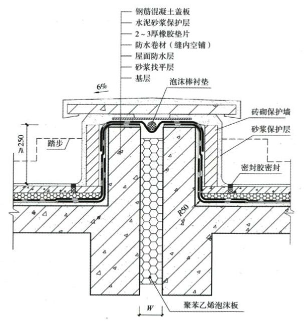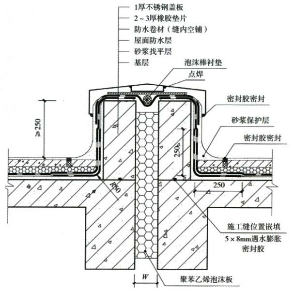 《屋面工程技術(shù)規(guī)范》 GB 50345-2012 4.11.18變形縫的防水構(gòu)造應(yīng)符合下列規(guī)定: 1.變形縫泛水處的防水層應(yīng)增設(shè)附加層,附加層在平面和立面的寬度不應(yīng)小于250mm;防水層應(yīng)鋪貼或刷至泛水墻的頂部。 2.變形縫內(nèi)應(yīng)預(yù)填保溫材料,上部應(yīng)采用防水卷材封蓋,并放置襯墊材料,再在其上干鋪一層卷材。 《屋面工程質(zhì)量驗收規(guī)范》 GB 50207-2012 8.6.5 等高變形縫頂部宜加扣混凝土或金屬蓋板。混凝土蓋板的接縫應(yīng)用密封材料封嚴;金屬蓋板應(yīng)鋪釘牢固,搭接縫應(yīng)順流水方向,并應(yīng)做好防銹處理。 8.6.6 高低跨變形縫在高跨墻面上的防水卷材封蓋和金屬蓋板,應(yīng)用金屬壓條釘壓固定,并應(yīng)用密封材料封嚴 |