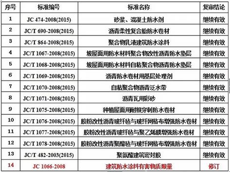建筑防水行業(yè)中,《砂漿、混凝土防水劑》(JC 474-2008)等13項(xiàng)標(biāo)準(zhǔn)繼續(xù)有效,《建筑防水涂料有害物質(zhì)限量》(JC 1066-2008)1項(xiàng)標(biāo)準(zhǔn)予以修訂。詳情如下: